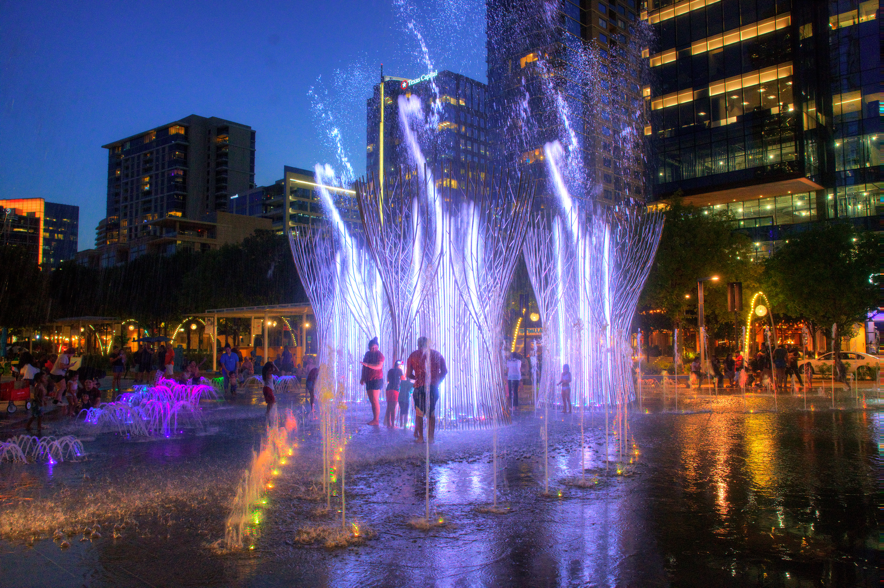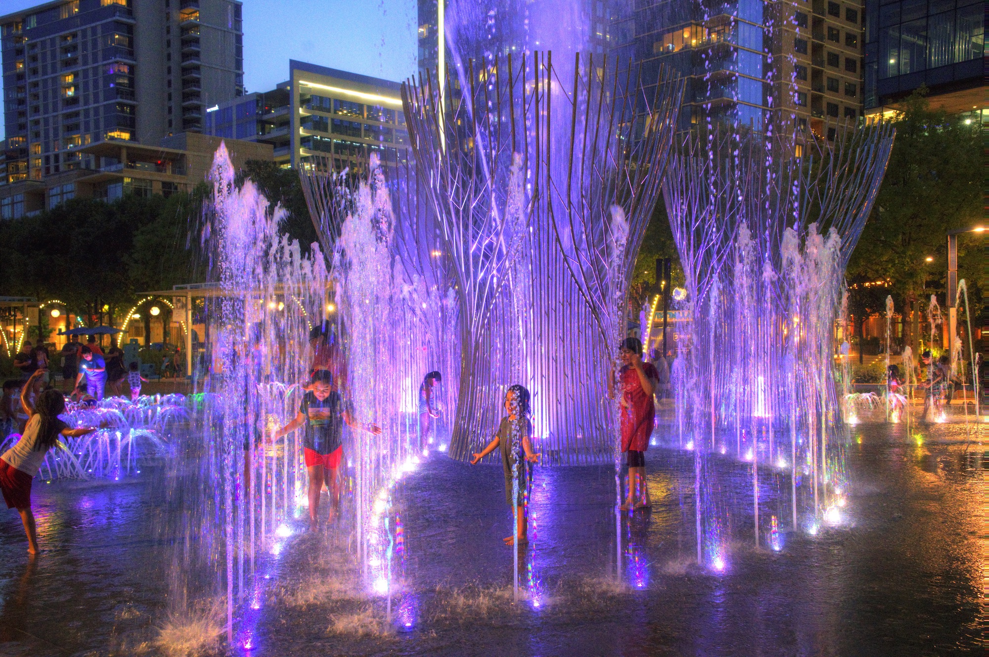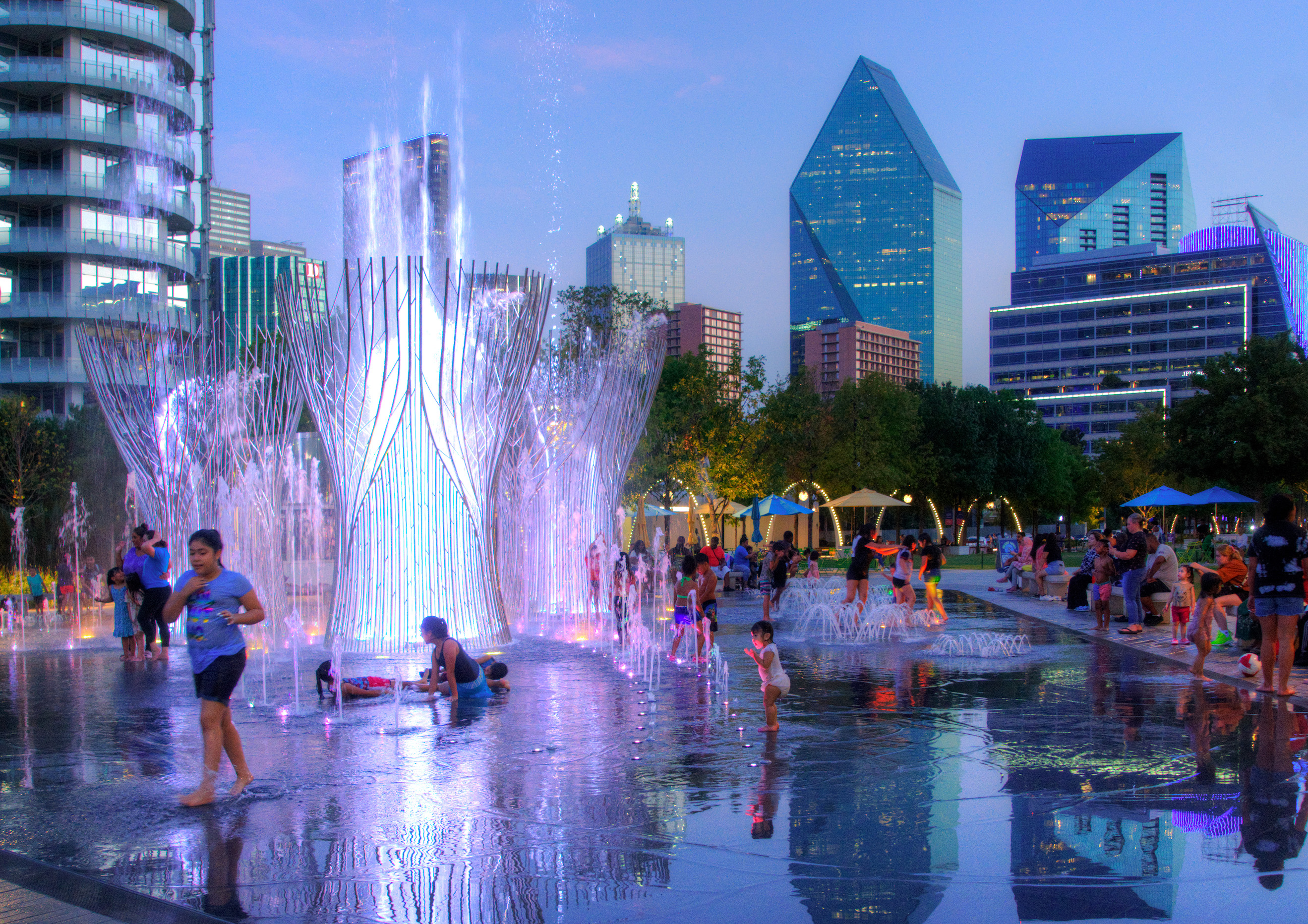 A sculptural, interactive, musical fountain activates the east end of Klyde Warren Park, in Dallas’ downtown Arts District, ten years after this highly regarded urban park first opened, which inaugurated a new era of community involvement in downtown spaces. The new fountain’s triangular plan incorporates a central composition of three polished stainless steel ‘Trees’ in the establishment of an iconic and meaningful design statement. The Trees enclose and render safe a collection of monumental jets and robotic streams that loft streams of water up to 90 feet high. The water feature is designed to invite players of all ages, with smaller clusters of jets populate the design’s west side, zoning friendly play areas for toddlers and their families. At night, the water feature’s music and water choreographies are further nuanced with changing-color light transformations.